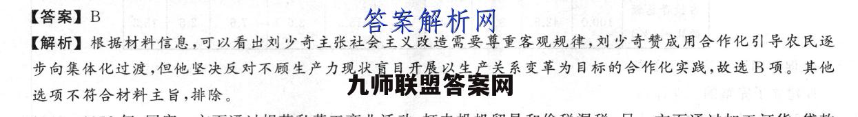 【答案】B【解析】根据材料信息,可以看出刘少奇主张社会主义改造需要尊重客观规律,刘少奇赞成用合作化引导农民逐步向集体化过渡,但他坚决反对不顾生产力现状盲目开展以生产关系变革为目标的合作化实践,故选B项。其他选项不符合材料主旨,排除。