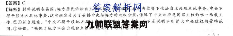 【答案】C【解析】材料说明在英国,地方居民依法自主组织地方公共机关,在中央监督下依法自主处理本地事务,中央不得干涉地方具体事务,这些规定是为了安排中央与地方的政权分层,保障了中夹政府是国家主权的唯一承载主体,②④符合题意。“中央不得干涉地方具体事务”说明地方权力大,而不是说明不断扩大中央政权的管辖范围,①错误。“确保了地方不会出现独立倾向”说法过于绝对,③排除。