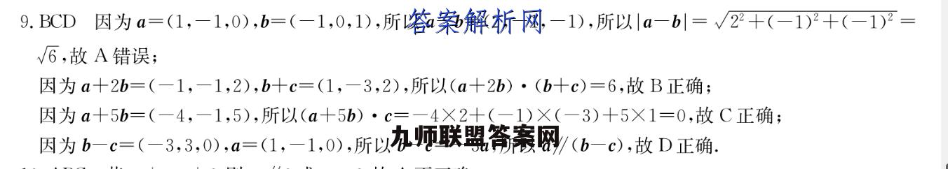 9.BCD因为a=(1,-1,0),b=(-1,0,1),所以a-b=(2,-1,-1),所以a-b=√/22+(-1)2+(一1)2=√6,故A错误;因为a+2b=(一1,一1,2),b十c=(1,-3,2),所以(a十2b)·(b十c)=6,故B正确:因为a+5b=(-4,一1,5),所以(a+5b)·c=-4×2+(-1)×(-3)+5×1=0,故C正确;因为b-c=(一3,3,0),a=(1,一1,0),所以b-c=一3a,所以a∥(b一c),故D正确.