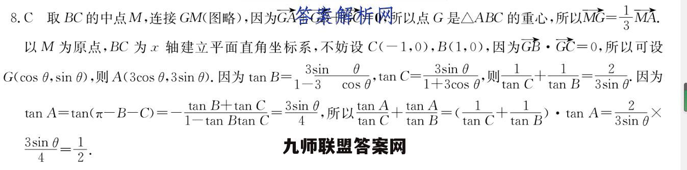 8.C取BC的中点M,连接GM(图略),因为G+G克+Gd=0,所以点G是△ABC的重心,所以M心=号Mi以M为原点,BC为x轴建立平面直角坐标系,不妨设C(一1,0),B(1,0),因为G范·GC=0,所以可设Gcos8.sm.则Aos3sn.因为amB=1”QgmC-1平0g则lcnB3品g因为3sin 02umA=nx-B0=巴8-2所以m急+A-(c+aBmA=3品3sin 0 12·
