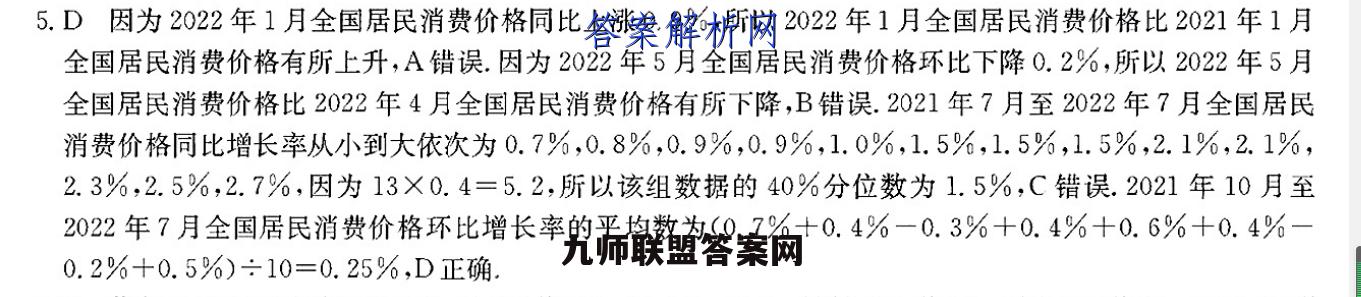 5.D因为2022年1月全国居民消费价格同比上涨0.9%,所以2022年1月全国居民消费价格比2021年1月全国居民消费价格有所上升,A错误.因为2022年5月全国居民消费价格环比下降0.2%,所以2022年5月全国居民消费价格比2022年4月全国居民消费价格有所下降,B错误.2021年7月至2022年7月全国居民消费价格同比增长率从小到大依次为0.7%,0.8%,0.9%,0.9%,1.0%,1.5%,1.5%,1.5%,2.1%,2.1%,2.3%,2.5%,2.7%,因为13×0.4=5.2,所以该组数据的40%分位数为1.5%,C错误.2021年10月至2022年7月全国居民消费价格环比增长率的平均数为(0.7%十0.4%一0.3%十0.4%十0.6%+0.4%一0.2%十0.5%)÷10=0.25%,D正确