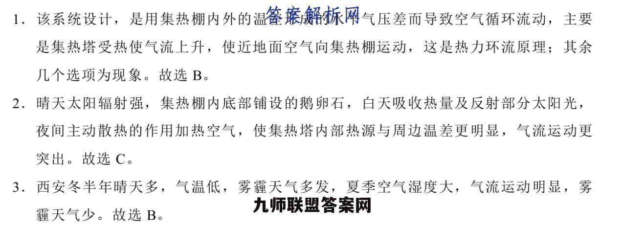 1.该系统设计,是用集热棚内外的温差形成的水平气压差而导致空气循环流动,主要是集热塔受热使气流上升,使近地面空气向集热棚运动,这是热力环流原理;其余几个选项为现象。故选B。2.晴天太阳辐射强,集热棚内底部铺设的鹅卵石,白天吸收热量及反射部分太阳光,夜间主动散热的作用加热空气,使集热塔内部热源与周边温差更明显,气流运动更突出。故选C。3.西安冬半年晴天多,气温低,雾霾天气多发,夏季空气湿度大,气流运动明显,雾霾天气少。故选B。