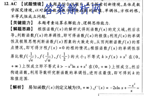 12.AC【试題情境】本題是综合性题目,属于探索创新情境,具体是数学探究情境,以对数函数为载体考查函数的极值、单调性,方程的根,不等式恒成立问题【关键能力】本题考查运算求解能力、逻辑思维能力【解题思路】根据函数f(x)的解析式得到函数∫(x)的定义域,然后求导,判断函数f(x)的单调性,即可得函数f(x)的极值;利用f(x)的单调及极限思想判断函数∫(x)图象的大致走向,从而判断函数f(x)的零点情况,即可得方程∫(x)=0的根的情况;根据函数∫(x)的单调性容易比教f(}),f(=),f(1)的大小;不等式k>f(x)+x在(0+∞)上恒成立即不等式k>-xhnx+x2在(0,+∞)上恒成立,然后构造函数,利用导数研究新函数的单调性,进而求最值,即可得到k的取值范围【解析】易知函数f(x)的定义域为(0,+∞),f(x)=-2nx+x(1+2lhx),令∫'(x)=-x(1+2lnx)=0,则1+2lnx=0,解得x=,当x∈(0,})时,f(x)>0,f(x)单调递增;当x∈(-,+∞)时,∫"(x)<0,∫(x)单调递减所以当x=一时,函数f(x)有极大值)敏选项A正确;因为f()=2>0,且当x→0时,∫(x)>0,当x→+∞时,f(x)<0,所以方程f(x)=0不可能有两个不同的实数根,选项B错误;因为函数∫(x)在(0,)上单调递增,且1>1>1=,所以f(-=)>f(=)>f(),选项C正确;不等√>式k>f(x)+x2在(0,+∞)上恒成立即不等式k>-xlnx+x2在(0,+∞)上恒成立,令g(x)=-x2lnx+x2,则g'(x)=x-2xlnx=x(1-2lnx),令g'(x)=x(1-2lnx)=0,则1-2lnx=0,解得x=√e,当x∈(0,、Ve)时,g(x)>0,g(x)单调递增;当xe(√G,+∞)时,g'(x)<0,g(x)单调递减.所以当x=Ve时,函数g(x)有最大值g(G)=2,所以k>2选项D错误