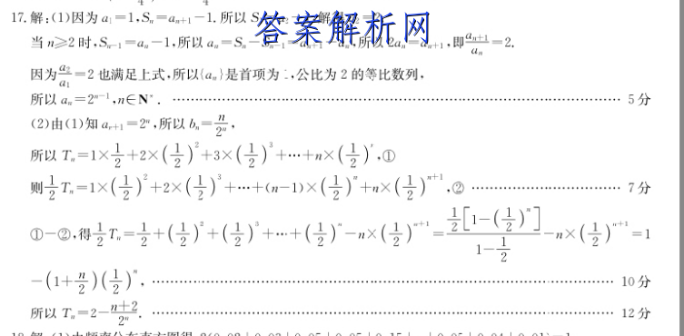 17.解:(1)因为a1=1,Sn=am+1-1.所以S1=a一1,解得a2=2.当n≥2时,S.-1=a。-1,所以a,=S。-S。-1=a+1一a,所以2an=a+1,即4出=2.因为=2也满足上式,所以{α}是首项为:,公比为2的等比数列,所以a.=2-1,n∈N*.…5分(2)由(1)知a+1=2",所以b,=”所以T.=1×2+2×(号)+3×(2)广++n×(号)广.①则号工.=1×(2)+2x(号)'++(m-1D×(受)广”+×(合)》.@…7分0-@号=+传+(传++传》x传》广-号门x(传》1-7-(1+)(2)八,10分所以T.=2一1十212分