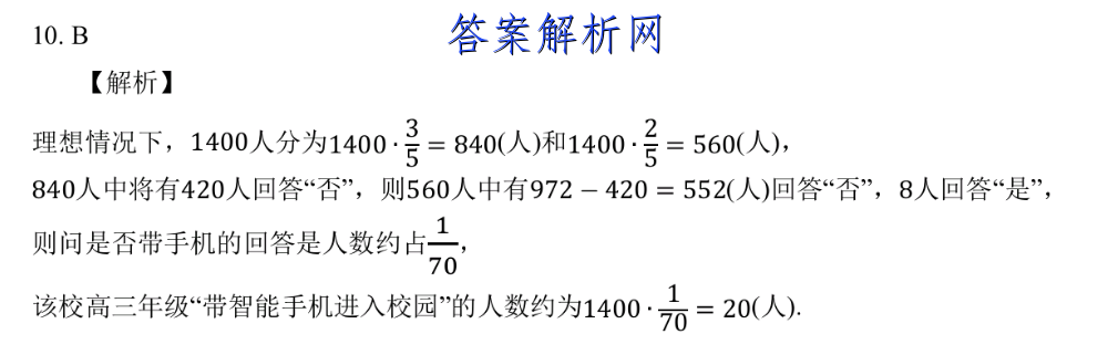 10.B【解析】理想情况下,140人分为140号=840人和1400号=560人)2840人中将有420人回答“否”,则560人中有972-420=552(人)回答“否”,8人回答“是”,则问是否带手机的回答是人数约占1该校高三年级“带智能手机进入校园”的人数约为1400·元=20(人)