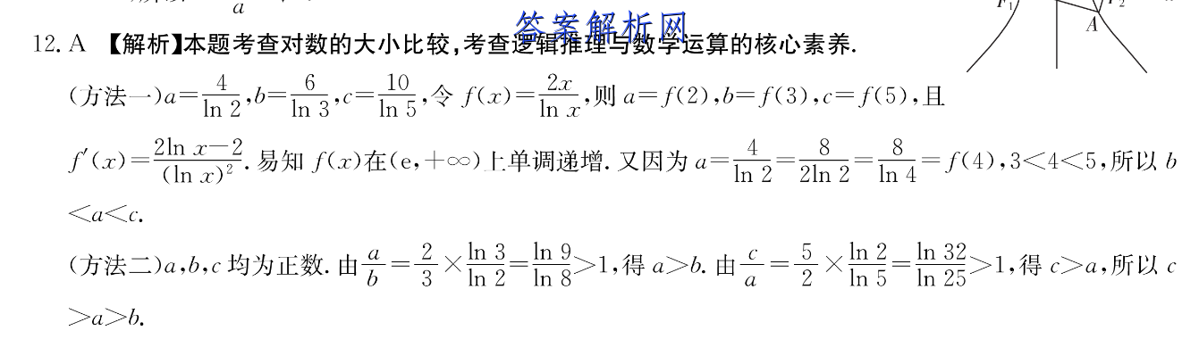 12.A【解析】本题考查对数的大小比较,考查逻辑推理与数学运算的核心素养(方法一)a=26=g=品令)42x,则a=f(2),b=f(3),c=f(5),且In x了)是易知)在eo)上单调选增又因为a品22.4.8<4<5,所以6KaC(方法二a6c均为正数由8=号×8-h8g-1,得a>a自日=8×号-h器>1,很≥a,所以c>a>b.