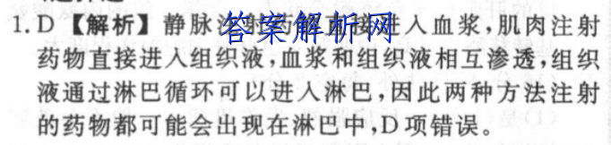 1.D【解析】静脉注射药物直接进入血浆,肌肉注射药物直接进入组织液,血浆和组织液相互渗透,组织液通过淋巴循环可以进入淋巴,因此两种方法注射的药物都可能会出现在淋巴中,D项错误。