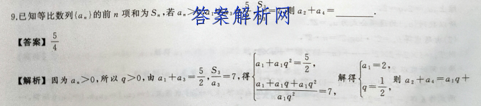 9.已知等比数列(a.}的前n项和为S.,若a,>0,a1十a:=名,=7,则a:十a=【答案】a1=2,解析】国为an>0,所以g>0,由a1十a,=号,=,la.ta.g'-5a1+a19+a1q2解得1则a2十a:=a19十aig'=7,9=2g-xx是