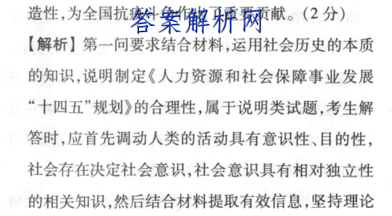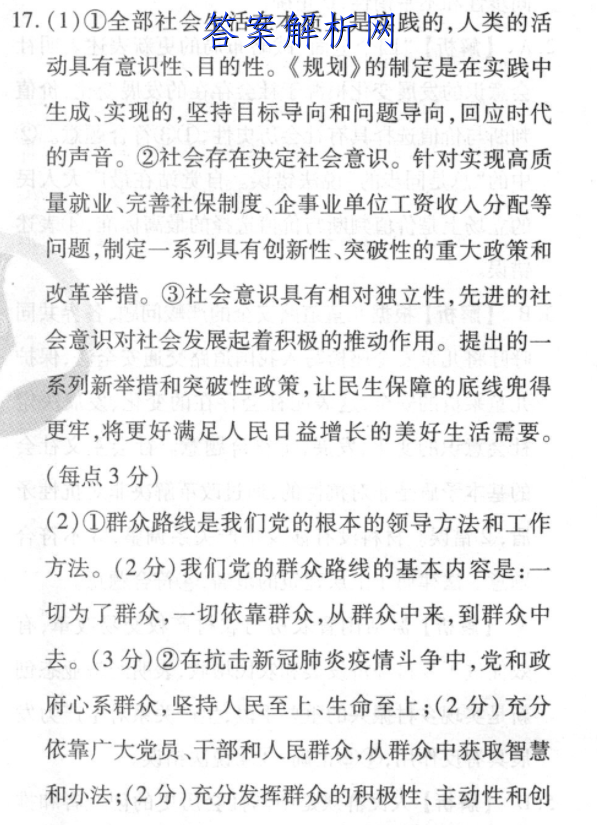 17.(1)①全部社会生活在本质上是实践的,人类的活动具有意识性、目的性。《规划》的制定是在实践中生成、实现的,坚持目标导向和问题导向,回应时代的声音。②社会存在决定社会意识。针对实现高质量就业、完善社保制度、企事业单位工资收人分配等问题,制定一系列具有创新性、突破性的重大政策和改革举措。③社会意识具有相对独立性,先进的社会意识对社会发展起着积极的推动作用。提出的一系列新举措和突破性政策,让民生保障的底线兜得更牢,将更好满足人民日益增长的美好生活需要。(每点3分)(2)①群众路线是我们党的根本的领导方法和工作方法。(2分)我们党的群众路线的基本内容是:一切为了群众,一切依靠群众,从群众中来,到群众中去。(3分)②在抗击新冠肺炎疫情斗争中,党和政府心系群众,坚持人民至上、生命至上;(2分)充分依靠广大党员、干部和人民群众,从群众中获取智慧和办法;(2分)充分发挥群众的积极性、主动性和创造性,为全国抗疫斗争作出了重要贡献。(2分)【解析】第一问要求结合材料,运用社会历史的本质的知识,说明制定《人力资源和社会保障事业发展“十四五”规划》的合理性,属于说明类试题,考生解答时,应首先调动人类的活动具有意识性、目的性,社会存在决定社会意识,社会意识具有相对独立性的相关知识,然后结合材料提取有效信息,坚持理论与材料相结合。第二问属于说明类试题,解答时,考生调动群众路线的相关知识回答即可。