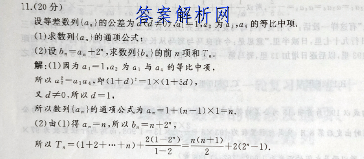 11.(20分)设等差数列{a.}的公差为d(d≠0),a1=1,a2为a1,a4的等比中项.甜因一料发容(1)求数列{a.}的通项公式;牙从三被已匹令:县想意“,里半斯日,里小十(2)设b.=am十2",求数列{bn}的前n项和T·搬在¥,里t日置司照,里69解:(1)因为a1=1,a2为a1与a4的等比中项,所以a=a1a4,即(1十d)2=1X(1+3d),又d≠0,所以d=1,所以数列{a.}的通项公式为an=1十(n一1)X1=n.前华01数(2)由(1)得am=n,所以bm=n十2",X日名漆a贵出传所以T.=(1+2+…十n)+21-2)=n(n+1)1-22+2(2-1).