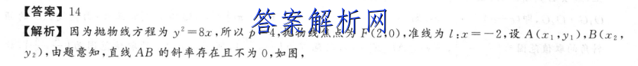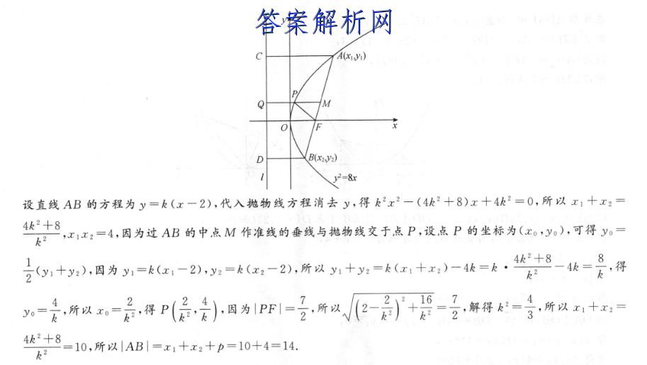 【答案】14【解析】因为抛物线方程为y2=8x,所以p=4,抛物线焦点为F(2,0),准线为l:x=一2,设A(x1,y1),B(x2,y2),由题意知,直线AB的斜率存在且不为0,如图,个A()PQMDB()y2=8x设直线AB的方程为y=k(x一2),代入抛物线方程消去y,得k2x2一(4k2十8)x十4k2=0,所以x1十x2=k,x1x:=4,因为过AB的中点M作准线的垂线与抛物线交于点P,设点P的坐标为(x0y),可得y,=4k2+8一=得十y:),因为y1=k(x1-2),y2=k(x:-2),所以y1十y:=k(x1十x:)-4k=.4桃82=会片以=是得P(层,)国为1P℉=名所以2-系)+=名解得=音所以十:=44k2+8k2=10,所以AB|=x1+x2十p=10+4=14.