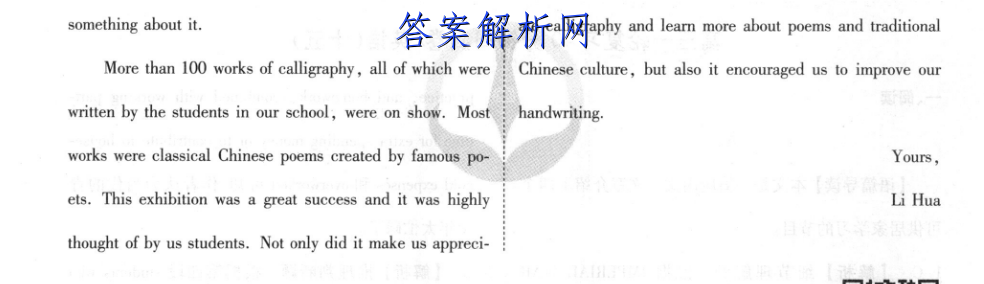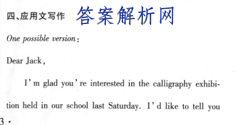 四、应用文写作One possible version:Dear Jack,I'm glad you're interested in the calligraphy exhibi-tion held in our school last Saturday.I'd like to tell yousomething about it.ate calligraphy and learn more about poems and traditionalMore than 100 works of calligraphy,all of which wereChinese culture,but also it encouraged us to improve ourwritten by the students in our school,were on show.Mosthandwriting.works were classical Chinese poems created by famous po-Yours,ets.This exhibition was a great success and it was highlyLi Huathought of by us students.Not only did it make us appreci-