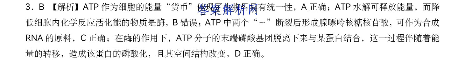 3.B【解析】ATP作为细胞的能量“货币”体现了生物界具有统一性,A正确;ATP水解可释放能量,而降低细胞内化学反应活化能的物质是酶,B错误;ATP中两个“~”断裂后形成腺嘌呤核糖核苷酸,可作为合成RNA的原料,C正确;在酶的作用下,ATP分子的末端磷酸基团脱离下来与某蛋白结合,这一过程伴随着能量的转移,造成该蛋白的磷酸化,且其空间结构改变,D正确。