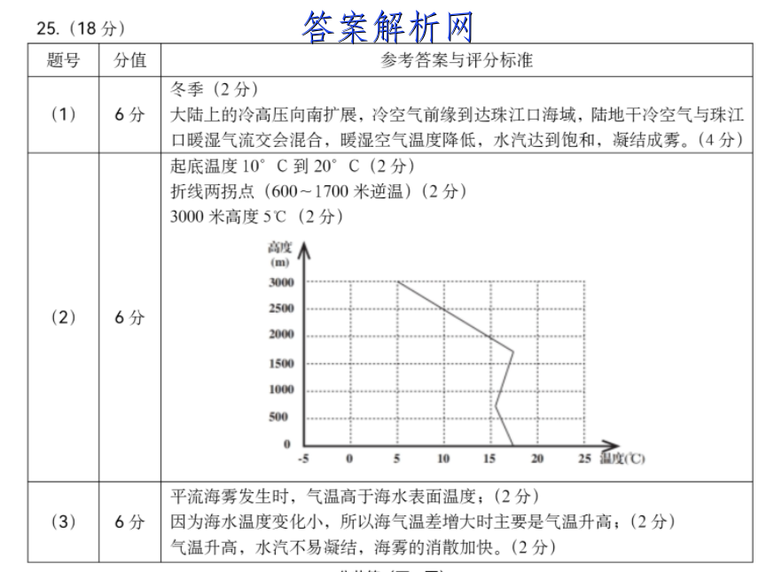 25.(18分)题号分值参考答案与评分标准冬季(2分)(1)6分大陆上的冷高压向南扩展,冷空气前缘到达珠江口海域,陆地干冷空气与珠江口暖湿气流交会混合,暖湿空气温度降低,水汽达到饱和,凝结成雾。(4分)起底温度10°C到20°C(2分)》折线两拐点(600~1700米逆温)(2分)3000米高度5℃(2分)高度(m)30002500(2)6分20001500100000510152025面度℃平流海雾发生时,气温高于海水表面温度;(2分)(3)6分因为海水温度变化小,所以海气温差增大时主要是气温升高:(2分)》气温升高,水汽不易凝结,海雾的消散加快。(2分)
