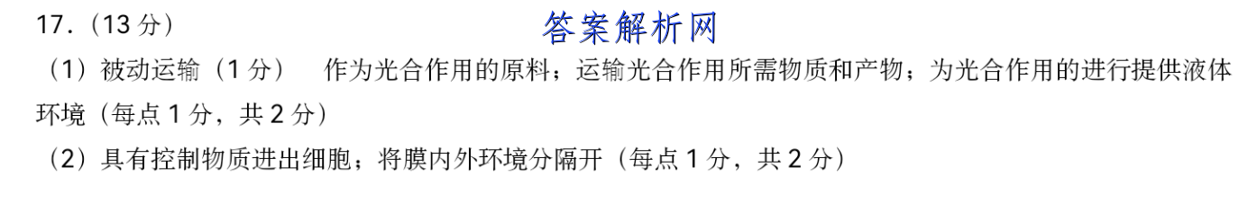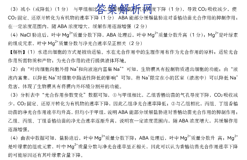 17.(13分)(1)被动运输(1分)作为光合作用的原料;运输光合作用所需物质和产物;为光合作用的进行提供液体环境(每点1分,共2分)(2)具有控制物质进出细胞;将膜内外环境分隔开(每点1分,共2分)(3)减小(或降低)(1分)与甲组相比,乙组香椿幼苗的气孔导度下降(1分),导致C02吸收减少,使CO2固定、还原并转化为有机物的速率下降(1分)ABA能部分缓解盐助迫对香椿幼苗光合作用的抑制作用:在一定浓度范围内,随ABA浓度增大,缓解作用逐渐增强(2分)(4)NaCl胁迫后,叶中Mg2+质量分数下降,ABA处理后,叶中Mg2质量分数升高(1分);Mg2是叶绿素的组成元素,叶中Mg2+质量分数与净光合速率呈正相关(2分)【解析】(1)水进出细胞的方式是被动运输。水在光合作用中的生理作用有作为光合作用的原料:运输光合作用所需物质和产物;为光合作用的进行提供液体环境。(2)由“叶肉细胞向胞外排Na和向液泡内富集Na”可知,生物膜具有控制物质进出细胞的功能;由“液泡内富集,以降低Na对细胞中酶活性降低的影响”可知,将Na限定在小的区室(液泡中)可以降低Na危害,体现了生物膜具有将膜内外环境分割开的功能。(3)分析表中“光合作用参数变化”数据可知,①与甲组相比,乙组香椿幼苗的气孔导度下降,C02吸收减少,CO2固定、还原并转化为有机物的速率下降,因此乙组净光合速率降低;②与乙组相比,丙组、丁组香椿幼苗的净光合作用速率均升高,但均小于甲组,说明ABA能部分缓解盐胁迫对香椿幼苗光合作用的抑制作用;乙组、丙组、丁组香椿幼苗的净光合速率逐渐升高,说明在一定浓度范围内,随ABA浓度增大,其缓解作用逐渐增强。(4)由表中数据可知,盐胁迫后,叶中Mg2质量分数下降,ABA处理后,叶中Mg2质量分数升高:Mg2是叶绿素的组成元素,叶中Mg质量分数与净光合速率呈正相关,因此可以认为香椿幼苗光合作用速率下降的可能原因还有其叶绿素含量下降。