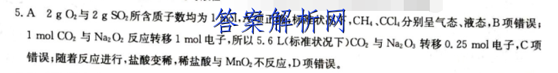 5.A2gO2与2gSO2所含质子数均为1mol,A项正确;标准状况下,CH.CCl分别呈气态、液态,B项错误;1 mol CO2与NaO2反应转移1mol电子,所以5.6L(标准状况下)CO2与NaO,转移0.25mol电子,C项错误;随着反应进行,盐酸变稀,稀盐酸与MnO2不反应,D项错误。