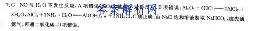 7.CNO与HO不发生反应,A项错误;SiO2与盐酸不发生反应,B项错误;A山O十6HCl一2AICl十3HzO,A1Cl,+3NH·HO一Al(OH),¥十3NHCl,C项正确,由NaCl饱和溶液制取NaHCO,应先通氨气,再通二氧化碳,D项错误。