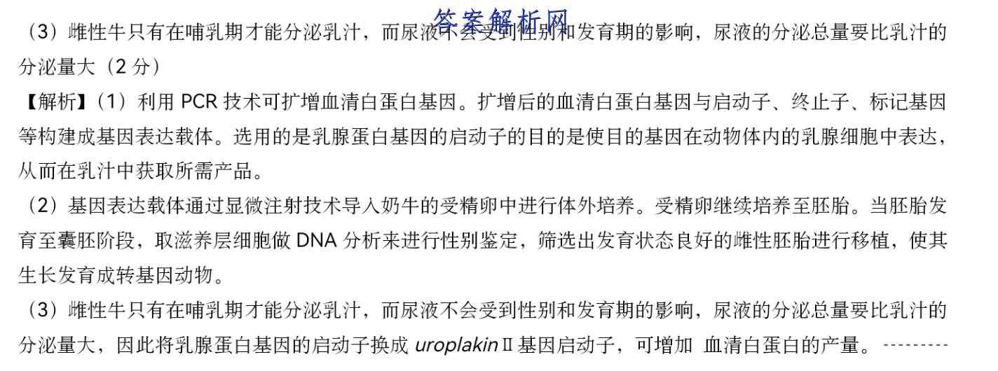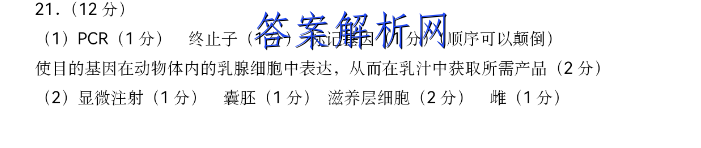 21.(12分)(1)PCR(1分)终止子(1分)标记基因(1分)(顶序可以颠倒)使目的基因在动物体内的乳腺细胞中表达,从而在乳汁中获取所需产品(2分)(2)显微注射(1分)囊胚(1分)滋养层细胞(2分)帷(1分)(3)雌性牛只有在哺乳期才能分泌乳汁,而尿液不会受到性别和发育期的影响,尿液的分泌总量要比乳汁的分泌量大(2分)【解析】(1)利用PCR技术可扩增血清白蛋白基因。扩增后的血清白蛋白基因与启动子、终止子、标记基因等构建成基因表达载体。选用的是乳腺蛋白基因的启动子的目的是使目的基因在动物体内的乳腺细胞中表达,从而在乳汁中获取所需产品。(2)基因表达载体通过显微注射技术导入奶牛的受精卵中进行体外培养。受精卵继续培养至胚胎。当胚胎发育至囊胚阶段,取滋养层细胞做DNA分析来进行性别鉴定,筛选出发育状态良好的雌性胚胎进行移植,使其生长发育成转基因动物。(3)雌性牛只有在哺乳期才能分泌乳汁,而尿液不会受到性别和发育期的影响,尿液的分泌总量要比乳汁的分泌量大,因此将乳腺蛋白基因的启动子换成uroplakinⅡ基因启动子,可增加血清白蛋白的产量。