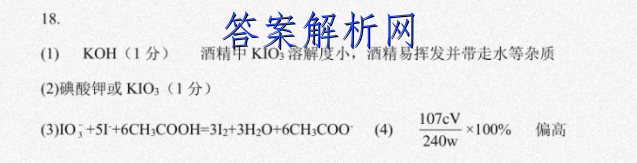 18.(1)KOH(1分)酒精中KIO溶解度小,酒精易挥发并带走水等杂质(2)碘酸钾或K1O(1分)(3)I0,+5I+6CHCO0H=312+3H0+6CHC00(4)107cN×100%偏高240w