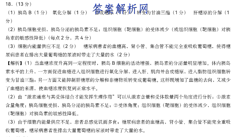 18.(13分)(1)胰岛B(1分)氧化分解(1分)合成糖原(1分)转变为甘油三酯(1分)肝糖原的分解(1分)(2)胰岛细胞受损,胰岛分泌的胰岛素不足;组织细胞(靶细胞)的受体减少(或组织细胞(靶细胞)对胰岛素的敏感性降低)(每点2分,共4分)(3)细胞内能量供应不足(2分)糖尿病患者的血糖高,肾小管、集合管不能完全重吸收葡萄糖,使得糖尿病忠者在排出大量葡萄糖的尿液时带走了大量的水(2分)【解析】(1)当血糖浓度升高到一定程度时,胰岛B细胞的活动增强,胰岛素的分泌量明显增加。体内胰岛素水平的上升,一方面促进血糖进入组织细胞进行氧化分解,进人肝、肌肉并合成糖原,进入脂肪组织细胞转变为甘油三酯:另一方面又能抑制肝糖原的分解和非糖物质转变成葡萄糖。这样既增加了血糖的去向,又减少了血糖的来源,使血糖浓度恢复到正常水平。(2)由“激茶通常与其受体结合才能发挥生理作用”可以从激素含量和受体数量两个角度进行分析:①激索含量角度:胰岛细胞受损,腆岛分泌的胰岛素不足;②受体角度:组织细胞(靶细胞)的受体减少,组织细胞(靶细胞)对胰岛素的敏感性降低。(3)由于细胞内能量供应不足,忠者总感觉饥而多食;糖尿病忠者的血糖高,肾小管、集合管不能完全重吸收葡萄糖,糖尿病患者在排出大量葡萄糖的尿液时带走了大量的水。