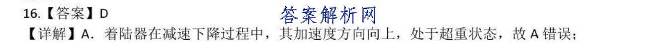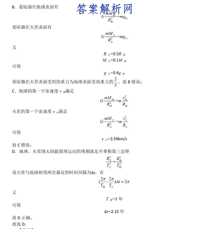 16.【答案】D【详解】A.着陆器在减速下降过程中,其加速度方向向上,处于超重状态,故A错误;B.着陆器在地球表面有GmM地=mg绝R品着陆器在火星表面有Mk=g水GR欧又R火=0.5R地M火=0.1M地可得8火=0.4g燃着陆器在火星表面受到的重力为地球表面受到重力的?,故B错误:C.地球的第一宇宙速度v满足R火星的第一宇宙速度¥满足mM火=mGRi水可得vx=3.59km/s故C错误:D.地球、火星绕太阳做圆周运动的周期满足开普勒第三定律器祭设火星与地球相邻两次最近的时间间隔为△,有2E )Al=27又T储=1年可得△-2.15年故D正确。故选D。