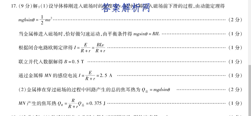 17.(9分)解:(1)设导体棒刚进人磁场时的速度为.对导体棒进入磁场前下滑的过程,由动能定理得mngbsint明=2mw(2分)当金属棒进人磁场时,恰好做匀速运动,由平衡条件得mgsint0=B1(1分)E BLv根据闭合电路欧姆定律得I=R+,R+r(1分)联立并代入数据解得B=0.5T…(1分)通过金属棒MN的感应电流I=E=2.5A(1分)R+r(2)金属棒在穿过磁场的过程中回路产生的总的焦耳热为Q总=mgdsint8(2分)MN产生的焦耳热QR=R+rRQ点=0.375J…(1分)
