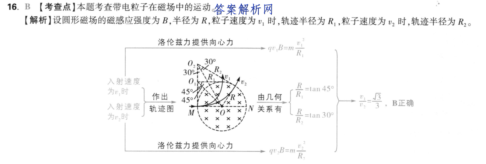 16.B【考查点】本题考查带电粒子在磁场中的运动。【解析】设圆形磁场的磁感应强度为B,半径为R,粒子速度为,时,轨迹半径为R1,粒子速度为2时,轨迹半径为R2。洛伦兹力提供向心力qB=m R30p02530°+,入射速度0R为,时45°R=tan 45作出、由几何R45°入射速度轨迹图×N关系有=3,B正确M×0×为v,时=lan30°R洛伦兹力提供向心力qv,B=mR