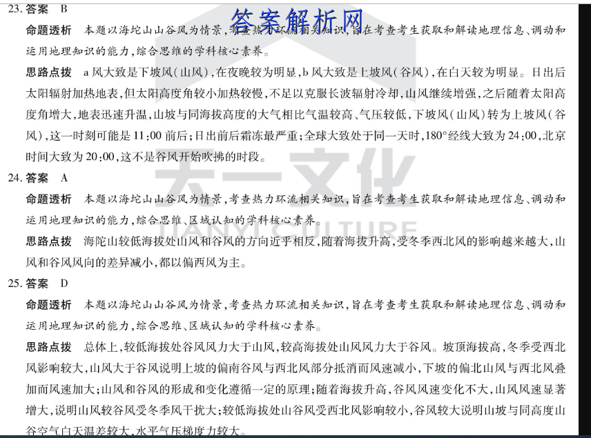 23.答案B命题透析本题以海坨山山谷风为情景,考查热力环流相关知识,旨在考查考生获取和解读地理信息、调动和运用地理知识的能力,综合思雏的学科核心素养。思路点拨风大致是下坡风(山风),在夜晚较为明显,b风大致是上坡风(谷风),在白天较为明显。日出后太阳辐射加热地表,但太阳高度角较小加热较慢,不足以克服长波辐射冷却,山风继续增强,之后随着太阳高度角增大,地表迅速升温,山坡与同海拔高度的大气相比气温较高、气压较低,下坡风(山风)转为上坡风(谷风),这一时刻可能是11:00前后;日出前后霜冻最严重;全球大致处于同一天时,180°经线大致为24:00,北京时间大致为20:00,这不是谷风开始吹拂的时段。24.答案A命题透析本题以海坨山山谷风为情景,考查热力环流相关知识,旨在考查考生获取和解读地理信息、调动和运用地理知识的能力,综合思雏、区域认知的学科核心素养思路点拨海陀山较低海拔处山风和谷风的方向近乎相反,随着海拔升高,受冬季西北风的影响越来越大,山风和谷风风向的差异减小,都以偏西风为主。25.答案D命题透析本题以海坨山山谷风为情景,考查热力环流相关知识,旨在考查考生获取和解读地理信息、调动和运用地理知识的能力,综合思雏、区域认知的学科核心素养。思路点拨总体上,较低海拔处谷风风力大于山风,较高海拔处山风风力大于谷风。坡顶海拔高,冬季受西北风影响较大,山风大于谷风说明上坡的偏南谷风与西北风部分抵消而风速减小,下坡的偏北山风与西北风叠加而风速加大;山风和谷风的形成和变化遵循一定的原理:随着海拔升高,谷风风速变化不大,山风风速显著增大,说明山风较谷风受冬季风干扰大:较低海拔处山谷风受西北风影响较小,谷风较大说明山坡与同高度山谷空气白天温差较大水平气压梯度力较大