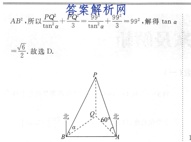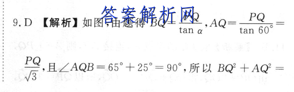 9.D【解析】如图,由题得BQ=PQ,AQ=PQtan atan 60P,且∠AQB=65°+25°=90°,所以BQ+AQ=AB,所以PQ+P2_992992tan'a3=992,解得tana故选D.北60北