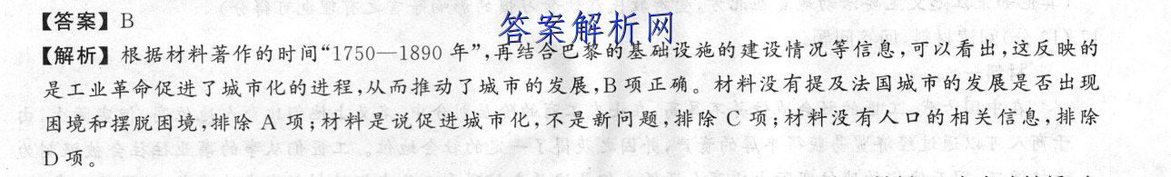 【答案】B【解析】根据材料著作的时间“1750一1890年”,再结合巴黎的基础设施的建设情况等信息,可以看出,这反映的是工业革命促进了城市化的进程,从而推动了城市的发展,B项正确。材料没有提及法国城市的发展是否出现困境和摆脱困境,排除A项;材料是说促进城市化,不是新问题,排除C项;材料没有人口的相关信息,排除D项。