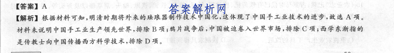 【答案】A【解析】根据材料可知,明清时期将外来的珐琅器制作技术中国化,这体现了中国手工业技术的进步,故选A项。材料未说明中国手工业生产领先世界,排除B项;鸦片战争后,中国被迫卷入世界市场,排除C项;西学东渐指的是传教士向中国传播西方科学技术,排除D项。T气报外地重,