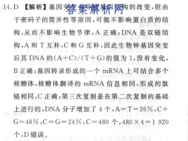 14.D【解析】基因突变会导致基因结构的改变,但由于密码子的简并性等原因,可能不影响蛋白质的结构,从而不影响生物节律,A正确;DNA是双链结构,A和T互补,C和G互补,因此生物钟基因突变后其DNA的(A十C)/(T+G)的值为1,没有变化,B正确;基因转录形成的一个mRNA上可结合多个核糖体,核糖体翻译的RNA信息相同,形成的肽链相同,C正确;第三次复制是在第二次复制的基础上进行的,DNA分子增加了4个,A=T=26%,C+G=48%,C=G=24%,C=480个,480×4=1920个,D错误。