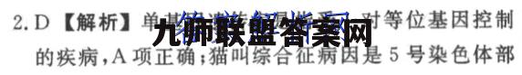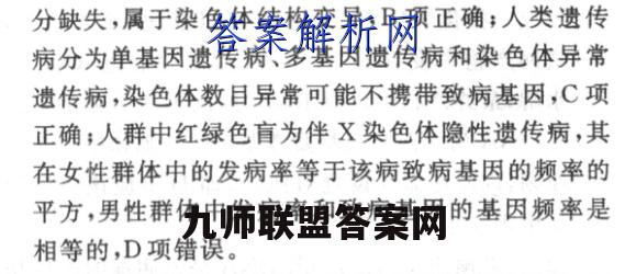 2.D【解析】单基因遗传病是指受一对等位基因控制的疾病,A项正确;猫叫综合征病因是5号染色体部分缺失,属于染色体结构变异,B项正确;人类遗传病分为单基因遗传病、多基因遗传病和染色体异常遗传病,染色体数目异常可能不携带致病基因,C项正确;人群中红绿色盲为伴X染色体隐性遗传病,其在女性群体中的发病率等于该病致病基因的频率的平方,男性群体中发病率和致病基因的基因频率是相等的,D项错误。
