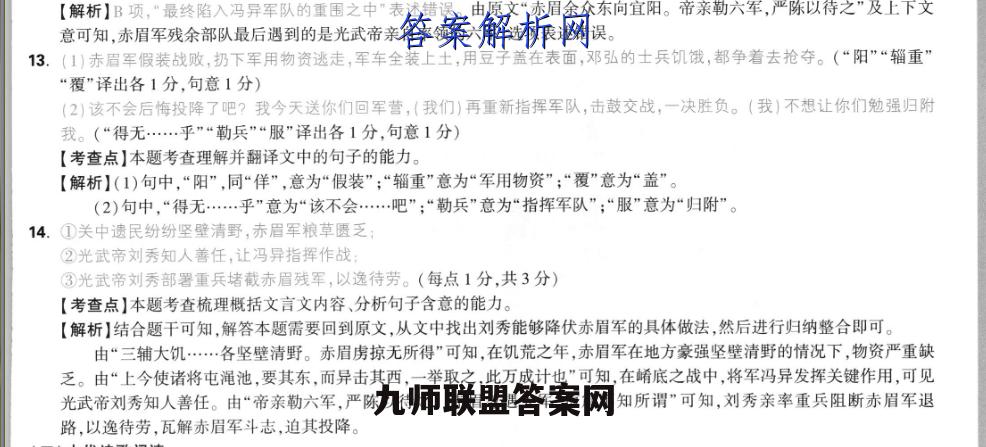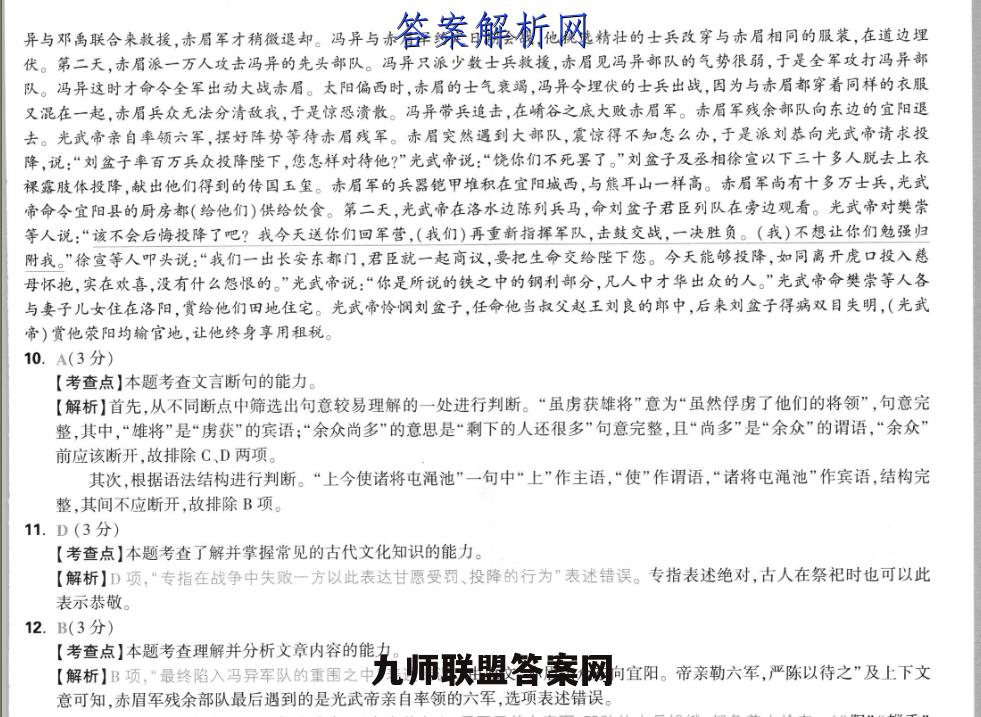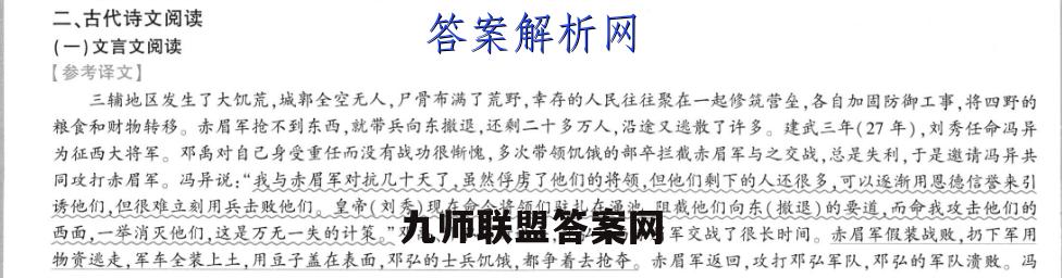 二、古代诗文阅读(一)文言文阅读【参考译文】三辅地区发生了大饥荒,城郭全空无人,尸骨布满了荒野,幸存的人民往往聚在一起修筑营垒,各自加固防御工事,将四野的粮食和财物转移。赤眉军抢不到东西,就带兵向东撤退,还剩二十多万人,沿途又逃散了许多。建武三年(27年),刘秀任命冯异为征西大将军。邓禹对自己身受重任而没有战功很惭愧,多次带领饥饿的部卒拦截赤眉军与之交战,总是失利,于是邀请冯异共同攻打赤眉军。冯异说:“我与赤眉军对抗儿十天了虽然俘虏了他们的将领,但他们剩下的人还很多,可以逐渐用恩德信登来引诱他们,但很难立刻用兵击败他们。皇帝(刘秀)现在命令将领们驻扎在渑池,阻截他们向东(撒退)的要道,而命我攻击他们的西面,一举消灭他们,这是万无一失的计策。”邓禹、邓弘不听进去,邓弘又与赤眉军交战了很长时间。赤眉军假装战败,扔下军用物资逃走,军车全装上土,用豆子盖在表面,邓弘的士兵饥饿,都争着去抢夺。赤眉军返回,攻打邓弘军队,邓弘的军队溃败。冯异与邓禹联合来救援,赤眉军才稍微退却。冯异与赤眉军约定日期会战,他挑选精壮的士兵改穿与赤眉相同的服装,在道边埋伏。第二天,赤眉派一万人攻击冯异的先头部队。冯异只派少数士兵救援,赤眉见冯异部队的气势很弱,于是全军攻打冯异部队。冯异这时才命令全军出动大战赤眉。太阳偏西时,赤眉的士气衰竭,冯异令埋伏的士兵出战,因为与赤眉都穿着同样的衣服又混在一起,赤眉兵众无法分清敌我,于是惊恐溃散。冯异带兵追击,在崤谷之底大败赤眉军。赤眉军残余部队向东边的宜阳退去。光武帝亲自率领六军,摆好阵势等待赤眉残军。赤眉突然遇到大部队,震惊得不知怎么办,于是派刘恭向光武帝请求投降,说:“刘盆子率百万兵众投降陛下,您怎样对待他?”光武帝说:“饶你们不死罢了。”刘盆子及丞相徐宣以下三十多人脱去上衣裸露肢体投降,献出他们得到的传国玉玺。赤眉军的兵器铠甲堆积在宜阳城西,与熊耳山一样高。赤眉军尚有十多万士兵,光武帝命令宜阳县的厨房都(给他们)供给饮食。第二天,光武帝在洛水边陈列兵马,命刘盆子君臣列队在旁边观看。光武帝对樊崇等人说:“该不会后悔投降了吧?我今天送你们回军营,(我们)再重新指挥军队,击鼓交战,一决胜负。(我)不想让你们勉强归附我。”徐宣等人叩头说:“我们一出长安东都门,君臣就一起商议,要把生命交给陛下您。今天能够投降,如同离开虎口投入慈母怀抱,实在欢喜,没有什么怨恨的。”光武帝说:“你是所说的铁之中的钢利部分,凡人中才华出众的人。”光武帝命樊崇等人各与妻子儿女住在洛阳,赏给他们田地住宅。光武帝怜阀刘盆子,任命他当叔父赵王刘良的郎中,后来刘盆子得病双目失明,(光武帝)赏他荥阳均输官地,让他终身享用租税。10.A(3分)【考查点】本题考查文言断句的能力。【解析】首先,从不同断点中筛选出句意较易理解的一处进行判断。“虽虏获雄将”意为“虽然俘虏了他们的将领”,句意完整,其中,“雄将”是“虏获”的宾语:“余众尚多”的意思是“剩下的人还很多”句意完整,且“尚多”是“余众”的谓语,“余众”前应该断开,故排除C、D两项。其次,根据语法结构进行判断。“上今使诸将屯渑池”一句中“上”作主语,“使”作谓语,“诸将屯渑池”作宾语,结构完整,其间不应断开,故排除B项。11.D(3分)【考查点】本题考查了解并掌握常见的古代文化知识的能力。【解析】D项,“专指在战争中失败一方以此表达甘愿受罚、投降的行为”表述错误。专指表述绝对,古人在祭祀时也可以此表示恭敬。12.B(3分)【考查点】本题考查理解并分析文章内容的能力。【解析】B项,“最终陷入冯异军队的重围之中"表述错误。由原文“赤眉余众东向宜阳。帝亲勒六军,严陈以待之”及上下文意可知,赤眉军残余部队最后遇到的是光武帝亲自率领的六军,选项表述错误。【解析】B项,“最终陷入冯异军队的重围之中"表述错误。由原文“赤眉余众东向宜阳。帝亲勒六军,严陈以待之”及上下文意可知,赤眉军残余部队最后遇到的是光武帝亲自率领的六军,选项表述错误。13.(1)赤眉军假装战败,扔下军用物资逃走,军车全装上土,用豆子盖在表面,邓弘的士兵饥饿,都争着去抢夺。(“阳”“辎重”“覆”译出各1分,句意1分)(2)该不会后悔投降了吧?我今天送你们回军营,(我们)再重新指挥军队,击鼓交战,一决胜负。(我)不想让你们勉强归附我。(“得无…乎”“勒兵”“服”译出各1分,句意1分)》【考查点】本题考查理解并翻译文中的句子的能力。【解析】(1)句中,“阳”,同“佯”,意为“假装”;“辎重”意为“军用物资”;“覆”意为“盖”。(2)句中,“得无…乎”意为“该不会…吧”:“勒兵”意为“指挥军队”;“服”意为“归附”。14.①关中遗民纷纷坚壁清野,赤眉军粮草匮乏2光武帝刘秀知人善任,让冯异指挥作战③光武帝刘秀部署重兵堵截赤眉残军,以逸待劳。(每点1分,共3分)》【考查点】本题考查梳理概括文言文内容、分析句子含意的能力。【解析】结合题干可知,解答本题需要回到原文,从文中找出刘秀能够降伏赤眉军的具体做法,然后进行归纳整合即可。由“三辅大饥…各坚壁清野。赤眉虏掠无所得”可知,在饥荒之年,赤眉军在地方豪强坚壁清野的情况下,物资严重缺乏。由“上今