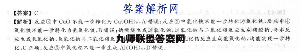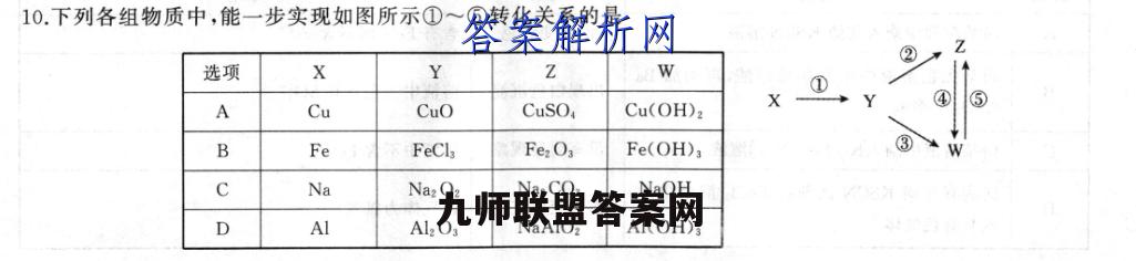 10.下列各组物质中,能一步实现如图所示①~⑤转化关系的是②Z选项XYZW①CuCuOCuSOCu(OH)2X④⑤ABFeFeClaFe2O3Fe(OH)3③WcNaNaz O2Na2CO3NaOHDAlA12O3NaAlOzAl(OH)3【答案】CT头d正是【花验】【解析】反应③中CuO不能一步转化为Cu(OH)2,A错误;反应②中氯化铁不能一步转化为氧化铁,反应中④氧化铁不能一步转化为氢氧化铁,B错误;钠燃烧生成过氧化钠,过氧化钠与二氧化碳反应生成碳酸钠、与水反应生成氢氧化钠,氢氧化钠与二氧化碳反应生成碳酸钠,碳酸钠与氢氧化钙反应生成氢氧化钠,均能实现一步转化,C正确;反应③中氧化铝不能一步生成A1(OH)3,D错误。