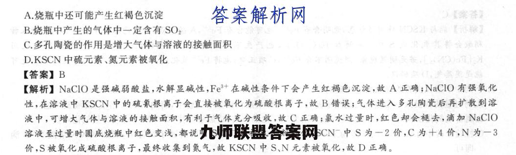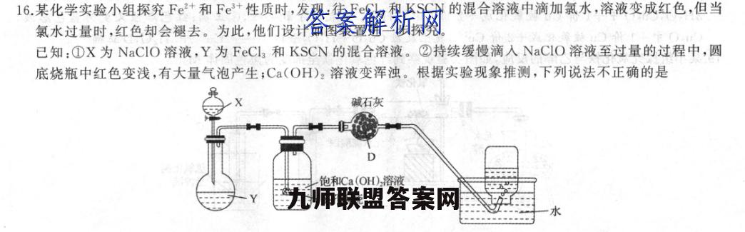 16.某化学实验小组探究Fe2+和Fe3+性质时,发现:往FeCl2和KSCN的混合溶液中滴加氯水,溶液变成红色,但当氯水过量时,红色却会褪去。为此,他们设计如图装置进一步探究。已知:①X为NaClO溶液,Y为FeCl3和KSCN的混合溶液。②持续缓慢滴入NaClO溶液至过量的过程中,圆底烧瓶中红色变浅,有大量气泡产生;C(OH)2溶液变浑浊。根据实验现象推测,下列说法不正确的是碱石灰D饱和Ca(OH),溶液多孔陶瓷A.烧瓶中还可能产生红褐色沉淀)【案答B.烧瓶中产生的气体中一定含有SO22【行豫C,多孔陶瓷的作用是增大气体与溶液的接触面积D.KSCN中硫元素、氮元素被氧化【答案】B【解析】NaC1O是强碱弱酸盐,水解显碱性,Fe3+在碱性条件下会产生红褐色沉淀,故A正确;NaClO有强氧化性,在溶液中KSCN中的硫氰根离子会直接被氧化为硫酸根离子,故B错误;气体进入多孔陶瓷后再扩散到溶液中,可增大气体与溶液的接触面积,有利于气体充分吸收,故C正确;氯水过量时,红色却会褪去,滴加NCIO溶液至过量时圆底烧瓶中红色变浅,都说明SCN-会被氧化剂氧化,SCN中S为一2价,C为十4价,N为一3价,S被氧化成硫酸根离子,最终收集到氦气,故KSCN中S、N元素被氧化,故D正确。