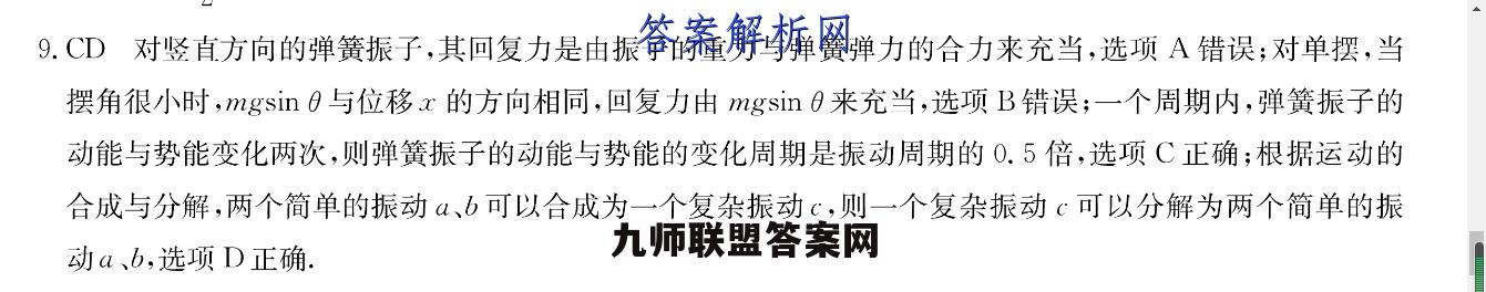9.CD对竖直方向的弹簧振子,其回复力是由振子的重力与弹簧弹力的合力来充当,选项A错误;对单摆,当摆角很小时,ngsin0与位移x的方向相同,回复力由ngsin0来充当,选项B错误;一个周期内,弹簧振子的动能与势能变化两次,则弹簧振子的动能与势能的变化周期是振动周期的0.5倍,选项C正确;根据运动的合成与分解,两个简单的振动、b可以合成为一个复杂振动c,则一个复杂振动c可以分解为两个简单的振动a、b,选项D正确.