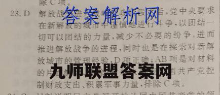 23.D解放成争进入战略反攻阶段之后,党中央要求在新解放的城市中谨慎地进行斗争,以团结一切可以团结的力量,减少不必要的纷争,进而推进解放战争的进程,同时也是在探素对新解放城市的管理经验,D项正确:AB项是对材料的片面解读,排除:材料未体现党控制财政支出、积累军事力量,排除C项。