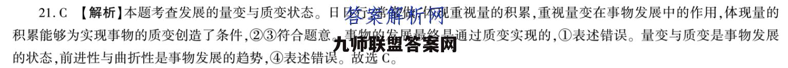 21.C【解析】本题考查发展的量变与质变状态。日日行,常常做,体现重视量的积累,重视量变在事物发展中的作用,体现量的积累能够为实现事物的质变创造了条件,②③符合题意。事物的发展最终是通过质变实现的,①表述错误。量变与质变是事物发展的状态,前进性与曲折性是事物发展的趋势,④表述错误。故选C。