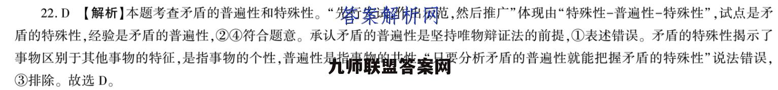 22.D【解析】本题考查矛盾的普遍性和特殊性。“先行先试,作出示范,然后推广”体现由“特殊性-普遍性-特殊性”,试点是矛盾的特殊性,经验是矛盾的普遍性,②④符合题意。承认矛盾的普遍性是坚持唯物辩证法的前提,①表述错误。矛盾的特殊性揭示了事物区别于其他事物的特征,是指事物的个性,普遍性是指事物的共性,“只要分析矛盾的普遍性就能把握矛盾的特殊性”说法错误,③排除。故选D。