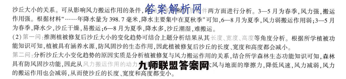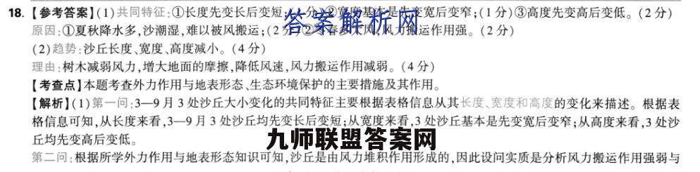 18.【参考答案】(1)共同特征:①长度先变长后变短;(1分)②宽度基本是先变宽后变窄;(1分)③高度先变高后变低。(2分)原因:①夏秋降水多,沙潮湿,难以被风搬运;(2分)②冬春多大风,风力搬运作用强。(2分)(2)趋势:沙丘长度、宽度、高度减小。(4分)理由:树木减弱风力,增大地面的摩擦,降低风速,风力搬运作用减弱。(4分)【考查点】本题考查外力作用与地表形态、生态环境保护的主要措施及其作用。【解析】(1)第一问:3一9月3处沙丘大小变化的共同特征主要根据表格信息从其长度、宽度和高度的变化来描述。根据表格信息可知,从长度来看,3一9月3处沙丘均先变长后变短;从宽度来看,3处沙丘基本是先变宽后变窄;从高度来看,3处沙丘均先变高后变低。第二问:根据所学外力作用与地表形态知识可知,沙丘是由风力堆积作用形成的,因此设问实质是分析风力搬运作用强弱与沙丘大小的关系。可从影响风力搬运作用的条件,即动力条件和物质条件两方面进行分析。3一5月为春季,风力强,搬运作用强。根据材料“…年降水量为398.7毫米,降水主要集中在夏秋季”可知,6一8月为夏季,风力弱搬运作用弱:3一5月为春季,降水少,沙丘干燥,易搬运:6一8月为夏季,降水多,沙丘潮湿,难搬运。(2)第一问:推测植被修复后沙丘大小的变化趋势可结合上题分析结果从其长度、宽度、高度等角度分析。根据所学植被功能知识可知,植被具有涵养水源,防风固沙的生态作用,因此植被修复后沙丘的长度、宽度和高度都会减小。第二问:分析沙丘大小变化趋势的原因实质是分析植被修复与风力搬运作用的关系,结合所学森林生态功能知识可知,森林具有防风固沙功能,因此从风力搬运作用的动力条件分析即可。树木会增大风与地面的摩擦力,降低风速,风力减弱,风力的搬运作用也会减弱,从而使沙丘的长度、宽度和高度都变小。