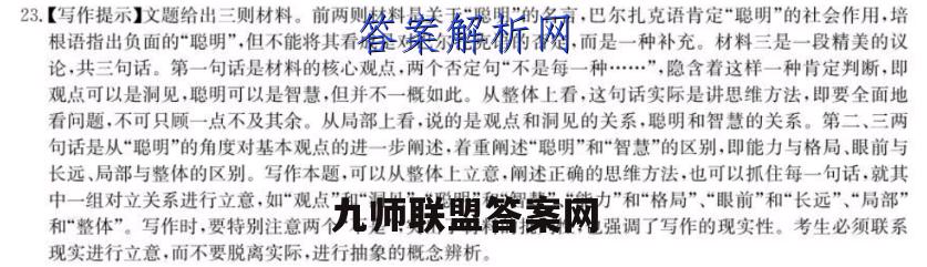 23.【写作提示】文题给出三则材料。前两则材料是关于“聪明”的名言,巴尔扎克语肯定“聪明”的社会作用,培根语指出负面的“聪明”,但不能将其看成是对巴尔扎克语的否定,而是一种补充。材料三是一段精美的议论,共三句话。第一句话是材料的核心观点,两个否定句“不是每一种…”,隐含着这样一种肯定判断,即观点可以是洞见,聪明可以是智慧,但并不一概如此。从整体上看,这句话实际是讲思维方法,即要全面地看问题,不可只顾一点不及其余。从局部上看,说的是观点和洞见的关系,聪明和智慧的关系。第二、三两句话是从“聪明”的角度对基本观点的进一步阐述,着重阐述“聪明”和“智慧”的区别,即能力与格局、眼前与长远、局部与整体的区别。写作本题,可以从整体上立意,阐述正确的思维方法,也可以抓住每一句话,就其中一组对立关系进行立意,如“观点”和“洞见”、“聪明”和“智慧”、“能力”和“格局”、“眼前”和“长远”、“局部”和“整体”。写作时,要特别注意两个“不是”,突出了材料的批判性,也强调了写作的现实性。考生必须联系现实进行立意,而不要脱离实际,进行抽象的概念辨析。