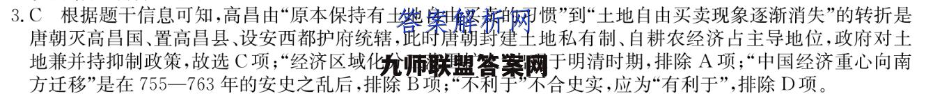 3.C根据题干信息可知,高昌由“原本保持有土地自由买卖的习惯”到“土地自由买卖现象逐渐消失”的转折是唐朝灭高昌国、置高昌县、设安西都护府统辖,此时唐朝封建土地私有制、自耕农经济占主导地位,政府对土地兼并持抑制政策,故选C项;“经济区域化分工范围扩大”出现于明清时期,排除A项;“中国经济重心向南方迁移”是在755一763年的安史之乱后,排除B项;“不利于”不合史实,应为“有利于”,排除D项。