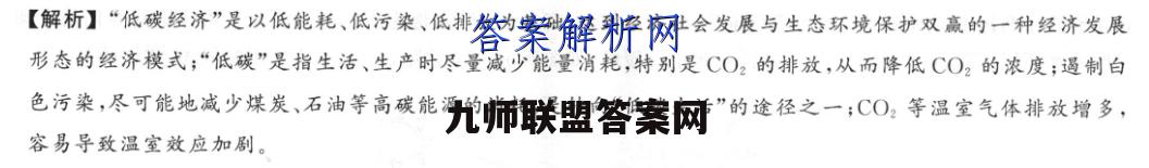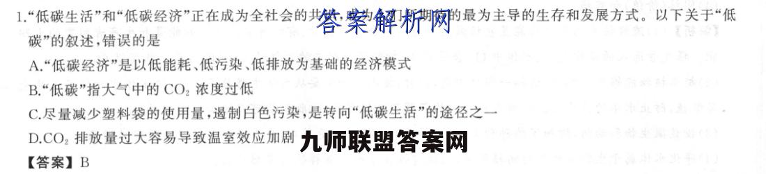 1.“低碳生活”和“低碳经济”正在成为全社会的共识,成为人们所期待的最为主导的生存和发展方式。以下关于“低碳”的叙述,错误的是A.“低碳经济”是以低能耗、低污染、低排放为基础的经济模式B.“低碳”指大气中的CO2浓度过低C.尽量减少塑料袋的使用量,遏制白色污染,是转向“低碳生活”的途径之一D.CO2排放量过大容易导致温室效应加剧【答案】B【解析】“低碳经济”是以低能耗、低污染、低排放为基础,达到经济社会发展与生态环境保护双赢的一种经济发展形态的经济模式;“低碳”是指生活、生产时尽量减少能量消耗,特别是CO2的排放,从而降低CO2的浓度;遏制白色污染,尽可能地减少煤炭、石油等高碳能源的消耗,是转向“低碳生活”的途径之一;CO2等温室气体排放增多,容易导致温室效应加剧。