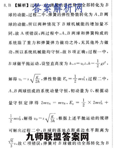 8.B【解析】过程一中,弹簧的弹性势能全部转化为B球的动能,过程二中,弹簧的弹性势能转化为A、B两球的动能,所以两种情况下B球机械能的增加量不同,故A项错误;两过程中,A、B两球和弹簧构成的系统除了重力和弹簧弹力做功之外,无其他外力做功,所以系统机械能均守恒,故B项正确;过程一中,B球做平抛运动,设竖直高度为h,s=t,h=2g解得v=s弹性势能E=mt;过程二中,A、B两球组成的系统动量守恒,初动量为0,根据动量守恒定律得2mn=mm,E=×2mn+mt,解得v=V高根据上述平抛运动的规律可解出过程二中,B球的落地点距桌边水平距离为s,故C项错误;弹簧对B球做的功全部转化为B球脱离弹簧时的动能,所以弹簧对B球做功之比为B2 mBv球两次动能之比1=2,故D项错误。BZ