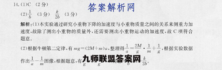 14.(1)C(2分)(2)(3分)k分解析:(1)本实验通过研究小重物下降的加速度与小重物质量之间的关系来测重力加速度,故除了测出小重物的质量外,还需要测出小重物运动的加速度,故C项符合题意。(2)根据牛顿第二定律,有mg=(2M+m)a,整理得1=2M.1+1,根据实验数据作出11图像,根据题意,有=b,2Mk,得gk