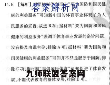 14.B【解析】根据材料体育事业“要为国防和国民健康的利益服务”可知新中国的体育事业体现了为人民服务的宗旨,故选B项;据材料“要为国防和国民健康的利益服务”强调了体育事业发展的宗旨问题,没有提及由谁主导,排除A项:据材料“要为国防和国民健康的利益服务”可知并不只是服务于国防,排除C项:据材料“提倡国民体育”可知促进了体育发展,不能代表教育的整体发展,排除D项。有