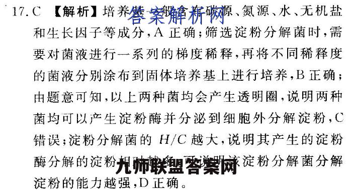 17.C【解析】培养基一般含有碳源、氮源、水、无机盐和生长因子等成分,A正确:筛选淀粉分解菌时,需要对菌液进行一系列的梯度稀释,再将不同稀释度的菌液分别涂布到固体培养基上进行培养,B正确;由题意可知,以上两种菌均会产生透明圈,说明两种菌均可以产生淀粉酶并分泌到细胞外分解淀粉,C错误;淀粉分解菌的【H/C越大,说明其产生的淀粉酶分解的淀粉相对越多,可说明该淀粉分解菌分解淀粉的能力越强,D正确。