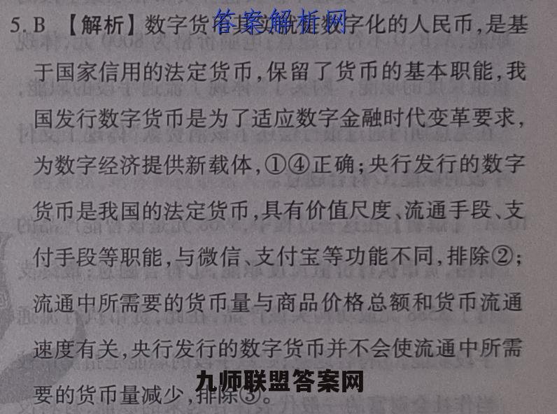 5,B【解析】数字货币其实就是数字化的人民币,是基于国家信用的法定货币,保留了货币的基本职能,我国发行数字货币是为了适应数字金融时代变革要求,为数字经济提供新载体,①④正确;央行发行的数字货币是我国的法定货币,具有价值尺度、流通手段、支付手段等职能,与微信、支付宝等功能不同,排除②;流通中所需要的货币量与商品价格总额和货币流通速度有关,央行发行的数字货币并不会使流通中所需要的货币量减少,排除③。