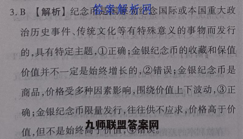3.B【解析】纪念币是国家为纪念国际或本国重大政治历史事件、传统文化等有特殊意义的事物而发行的,具有特定主题,①正确;金银纪念币的收藏和保值价值并不一定是始终增长的,②错误;金银纪念币是商品,价格受多种因素影响,围绕价值上下波动,③正确;金银纪念币限量发行,往往供不应求,价格高于价值,但不是始终高于价值,④错误。。